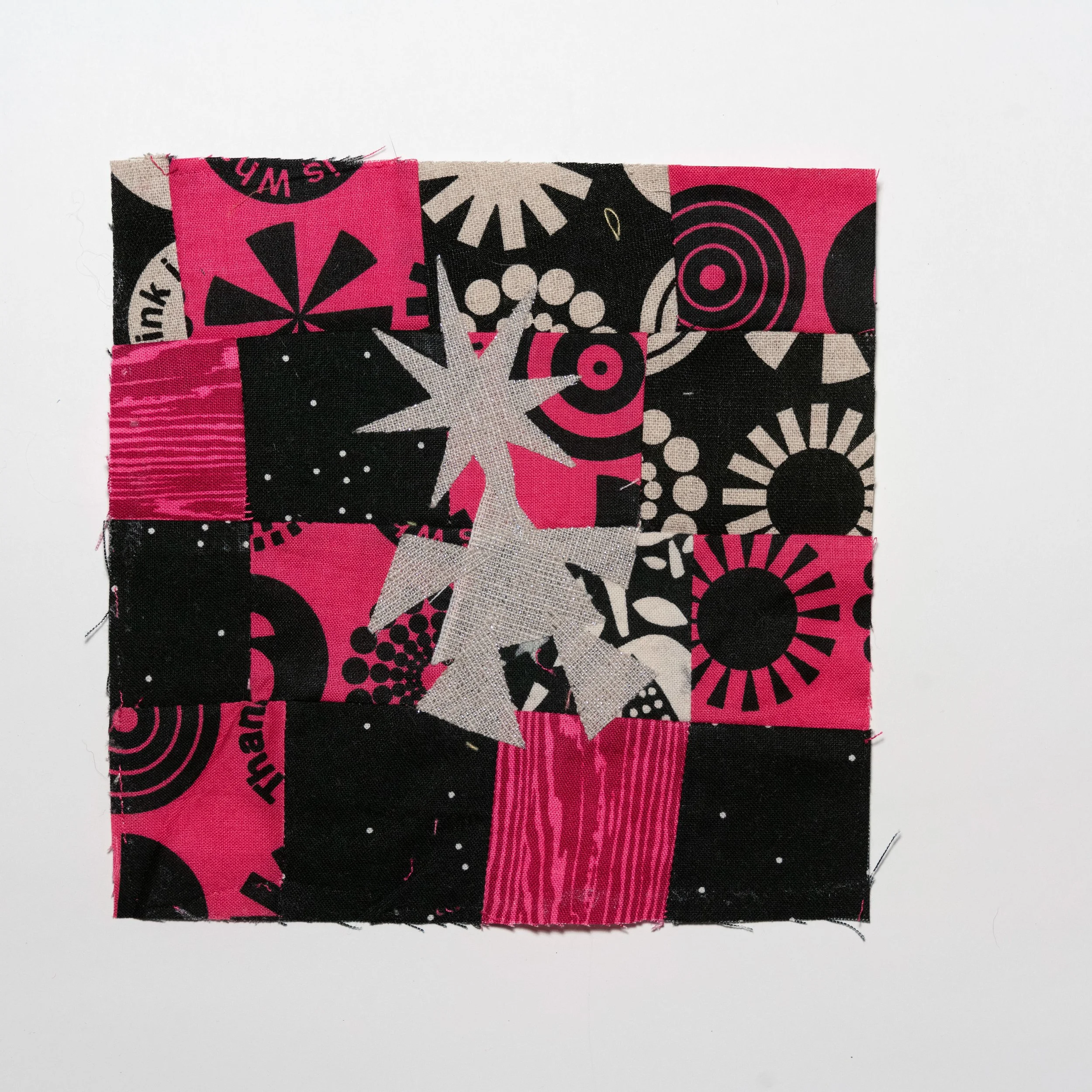Black, pink, and cream graphic patchwork fabric. Pieced together in small squares. A silver star shape is at the center of the square.