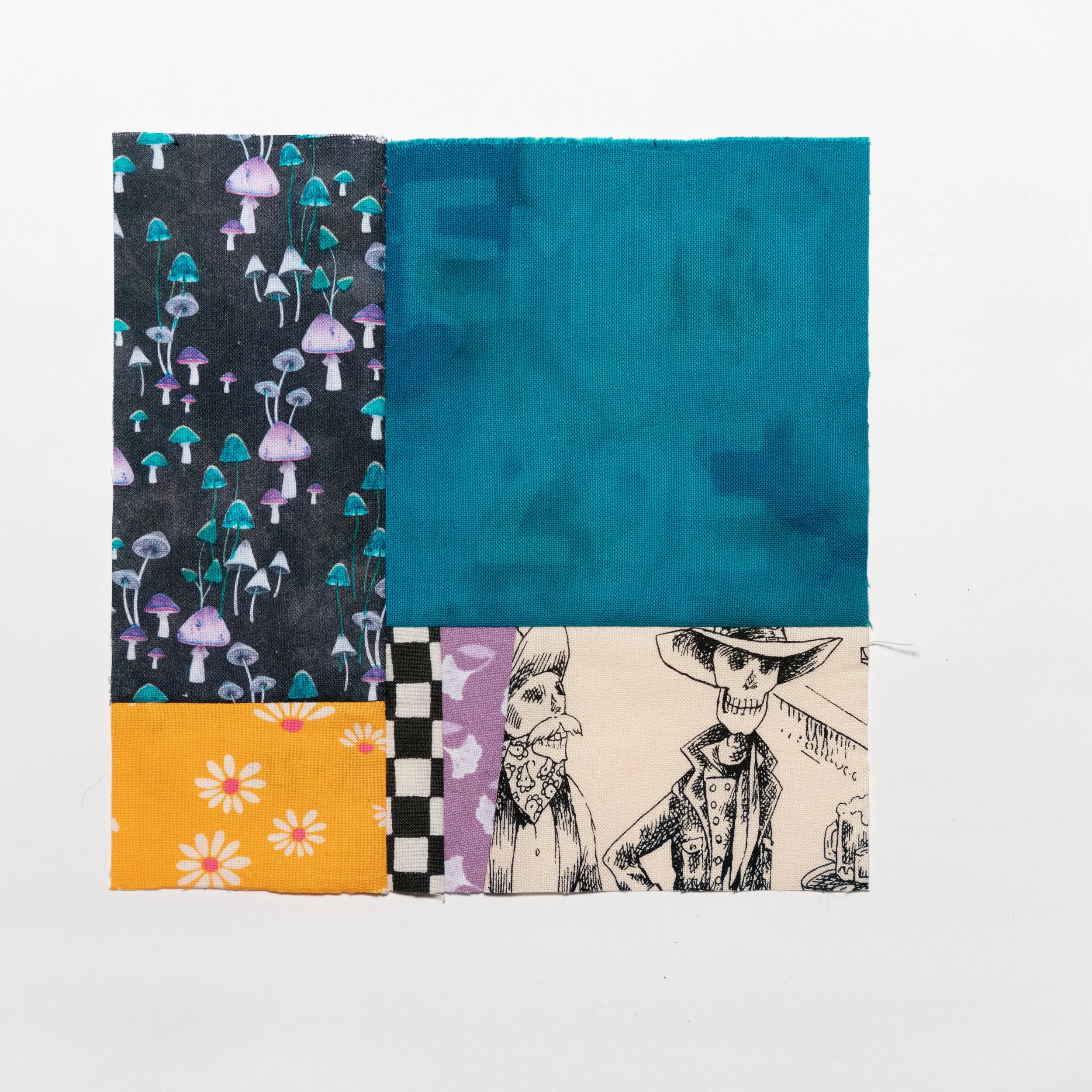 Cotton fabric scraps pieced together featuring a variety of fabrics such as mushrooms, skeletons, checkerboard, daisies, and a large square of blue fabric with subtle text 'Emory + Zoe'.