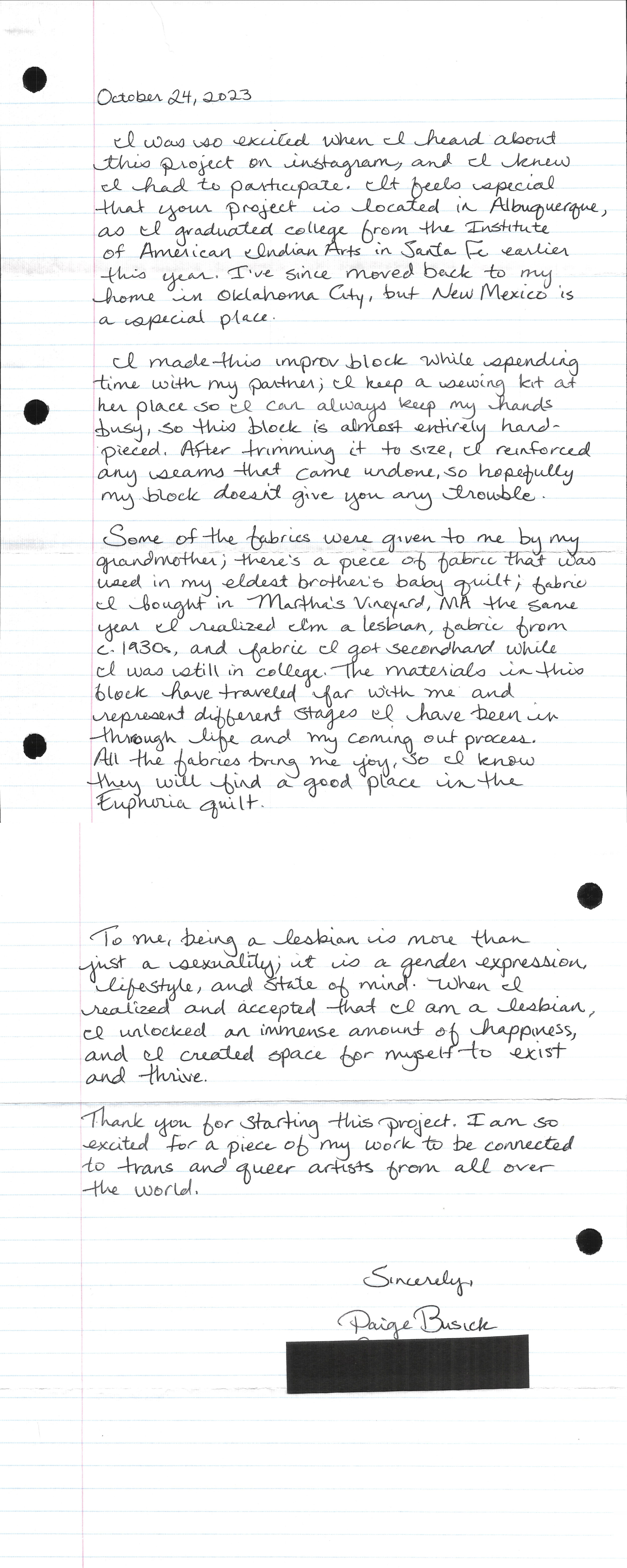 Sep 4 Written By Euphoria Quilt Project . Block Number #66CreatorPaige BusickCreator LocationOklahoma City, Oklahoma, USADate2023RightsThe Euphoria QuiltIdentifierTEQ-2024-02-36Transcription View Quilt Block ➙ Euphoria Quilt Project .