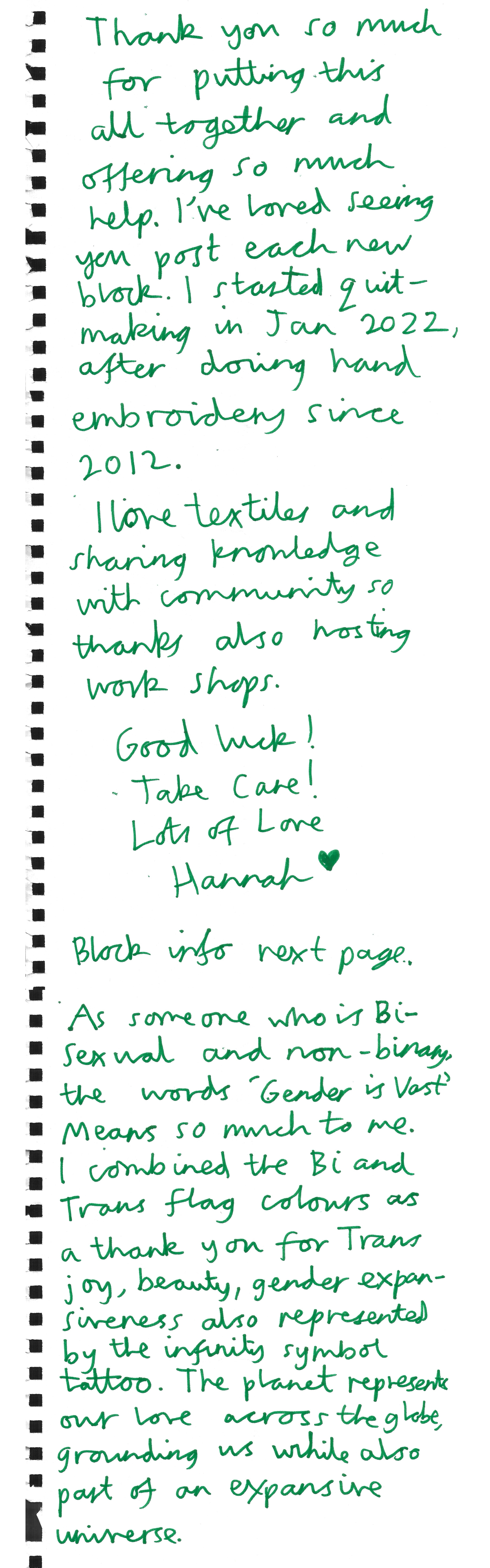 “Thank you so much for putting this all together and offering so much help. I’ve loved seeing you post each new block. I started quiltmaking in Jan 2022, after doing hand embroidery since 2012.